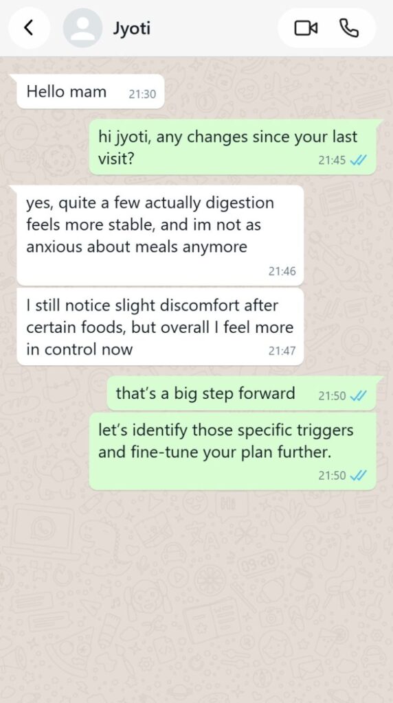 You’ll get a structured review: symptom timeline, food/stress triggers, current medicines, prior reports (if available), and daily routine. Then you receive clear next steps—what to start, what to avoid, and how to follow a consistent plan.